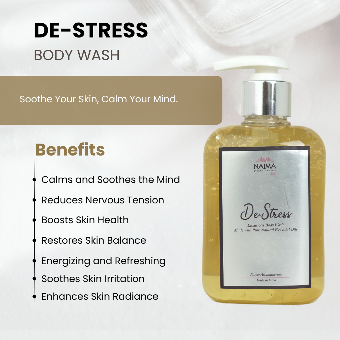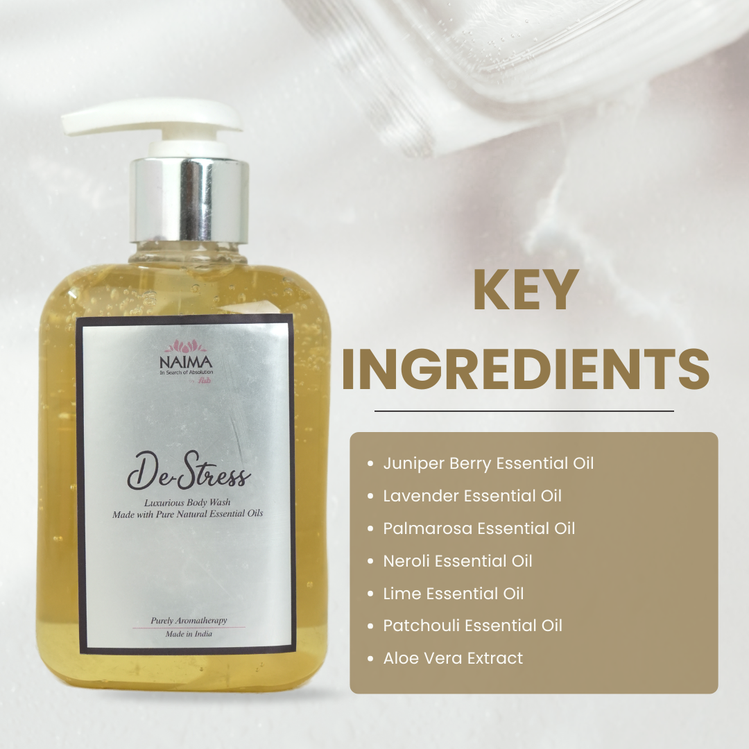 Stress is a natural feeling of not being able to cope with specific demands and events. However, stress can become a chronic condition if a person does not take steps to manage it. One of the areas in which aromatherapy can be most advantageous is for stress and emotional problems. This bodywash made with pure natural essential oils of juniper berry, lavender, palmarosa, neroli, lime and patchouli which are particularly effective for stress related problems and relieves your skin from stress markers which helps you attain a youthful glow.