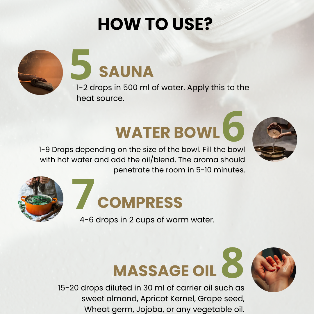 Massage Oil: 15-20 drops diluted in 30 ml of carrier oil such as sweet almond, Apricot Kernel, Grape seed, Wheat germ, Jojoba, or any vegetable oil.